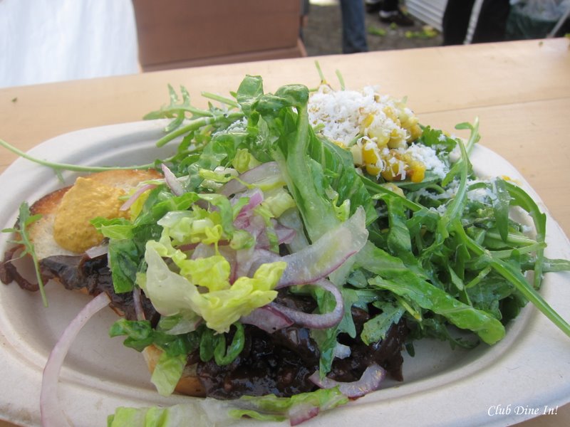 Prather Ranch Meat Co. has a storefront in the San Francisco Ferry Building and sells humanely raised, environmentally responsible beef, chicken, buffalo, pork, lamb, and vitellone. My options are always really slim and they are usually sold out of the one type of meat I am willing to eat (chicken). So naturally, I was pretty excited that they were offering an all vegan slider. I waited in line, made conversation with the gentleman behind me about my Canon S90, asked the people if the Mushroom Slider was really vegetarian twice, and ordered the slider with a side of sweet corn salad. All while salivating.