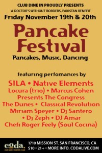 the last 1.5 months and it’s finally this weekend! Friday night, guests will enjoy and dance to world musicians performing live. Coda will have their dinner menu available and guests can reserve a table in advance. On Saturday, we will serve organic, sustainable pancakes buffet-style while bands play on stage. Tickets are only $10 for each day and 100% of the sale goes to Doctor’s Without Borders, Pakistan. We really need volunteers to make this event successful. We need volunteers to flip pancakes and man the buffet station. If you are interested, please contact me as soon as possible. More information: http://pancakefest.eventbrite.com/ This is a Club Dine In! event and I hope to see you there!