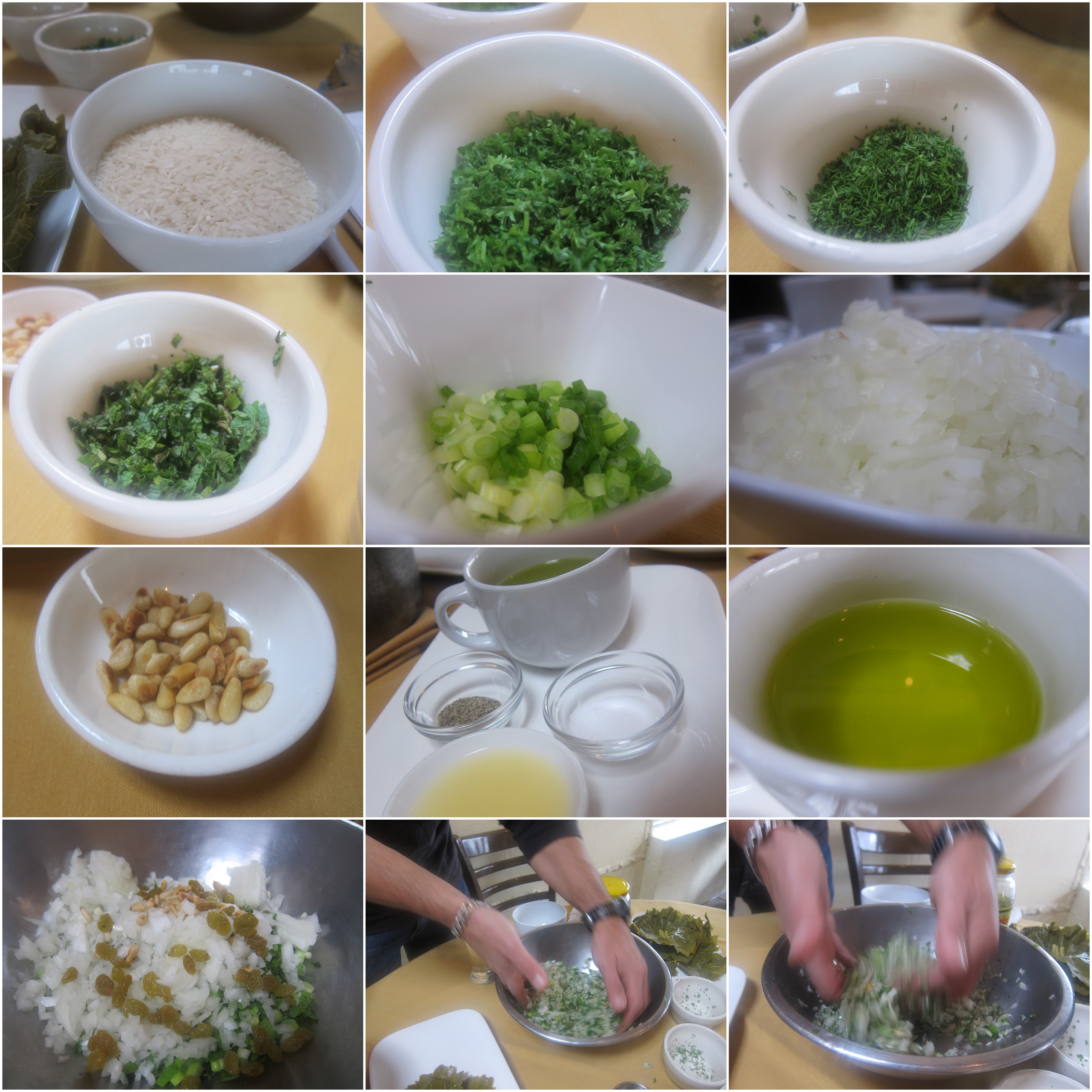 2.       In a large mixing bowl¸ toss together uncooked rice, parsley, dill, mint, green onion, onions, pine nuts, raisins, salt and pepper. Add in only half of the lemon juice and only half of the olive oil. Mix well all together with your hands.