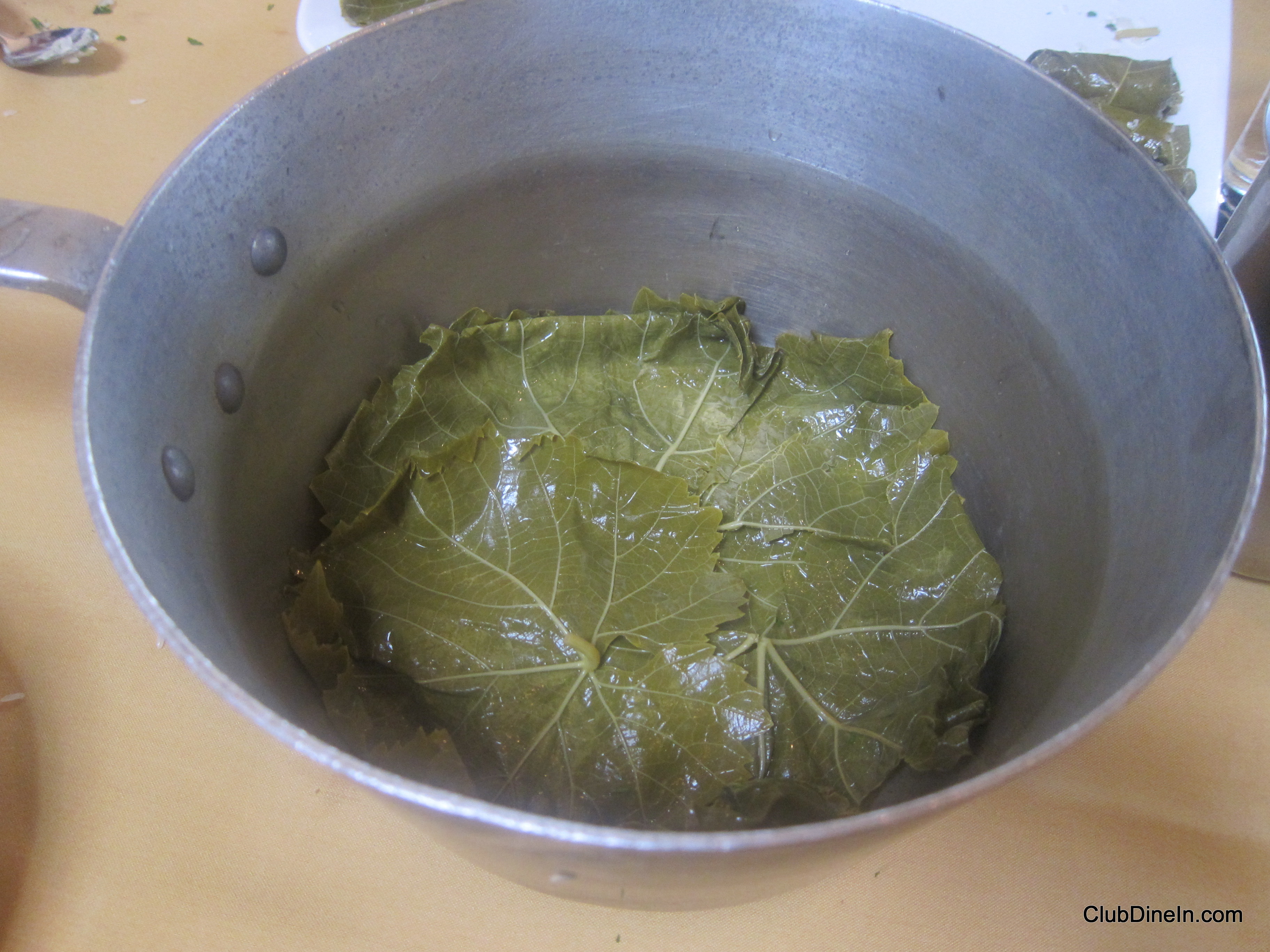 1.       Completely cover a large saucepan (bottom and sides) with about 4-5 uncooked grape leaves. Cook the remaining grape leaves by adding them in boiling water for about 4 minutes. The cooking removes the acidity from the packaged grape leaves.  Drain the leaves immediately.