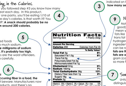 TIP: Different types of sugar can be listed separately. In the sample label on the PDF, Enriched Flour is followed by Corn Syrup, High Fructose Corn Syrup, and Dextrose. It’s very likely that there’s actually more sugar than flour in that product.