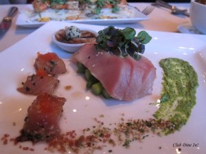 Since we arrived a bit early for our reservation, we got wine at the bar. Their wine list features mostly sustainably farmed wines from around the world. We were served marcona almonds to make up for the wait. They were really good, but a little sweet for a starter and we were really hungry. The micro-green garnish provided a great balance between sweet and savory.
