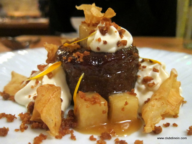After all of that and two more glasses of red wine, we were in a perfect state. Though, we could not pass up dessert. All of the options looked good and we debated between the chocolate brownie ($10) and a dessert made out of celery. Our waitress (Rachel) told us that the celery dessert was really like dessert and not a vegetable dish. Me being me, got the brownie. The micro-greens on the brownie balanced out the sweetness of the candied kumquats. I loved that this dessert wasn’t overpoweringly sweet. Compliments from the kitchen, we also got the celery root dessert. Wow. I don’t even know how to describe it, but Satish liked it over the brownie.