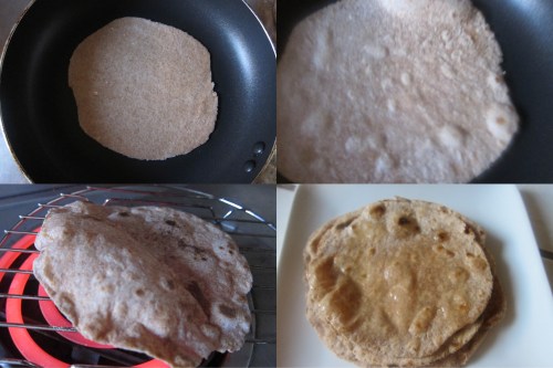 2. Heat non-stick skillet or tava on medium heat. Divide into golf ball size balls. Take one ball and press lightly it between your palms, to create a flat disk. Dip the flattened ball into the coating flour and roll it out into a thin disc with a rolling pin on a flat surface. Keep dipping the roti into the dry flour to prevent it from sticking to the rolling surface.