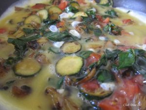 Beat the eggs in until foamy. Heat the oil in the pan and pour in the eggs, swirl to cover the pan with the eggs and let set slightly. Sprinkle the vegetables, herbs, salt and black pepper on the eggs. Let the eggs continue cooking until the liquid is almost set but still creamy and moist on top, about 2 minutes. Add salt last, as it will cause the eggs to toughen. Tip the pan over the serving plate, and gently shake the omelet onto the plate filling side first. Buen Provecho!
