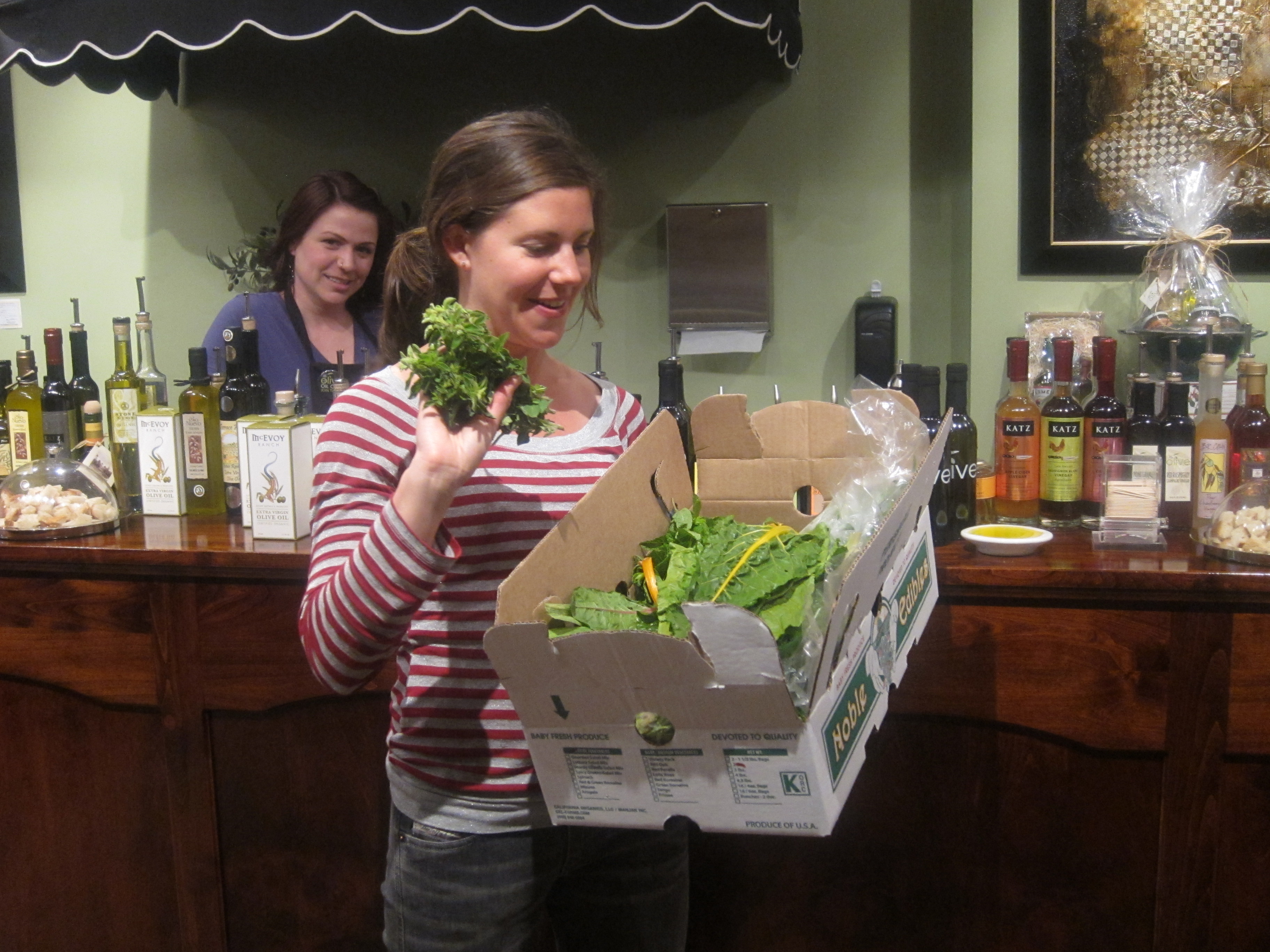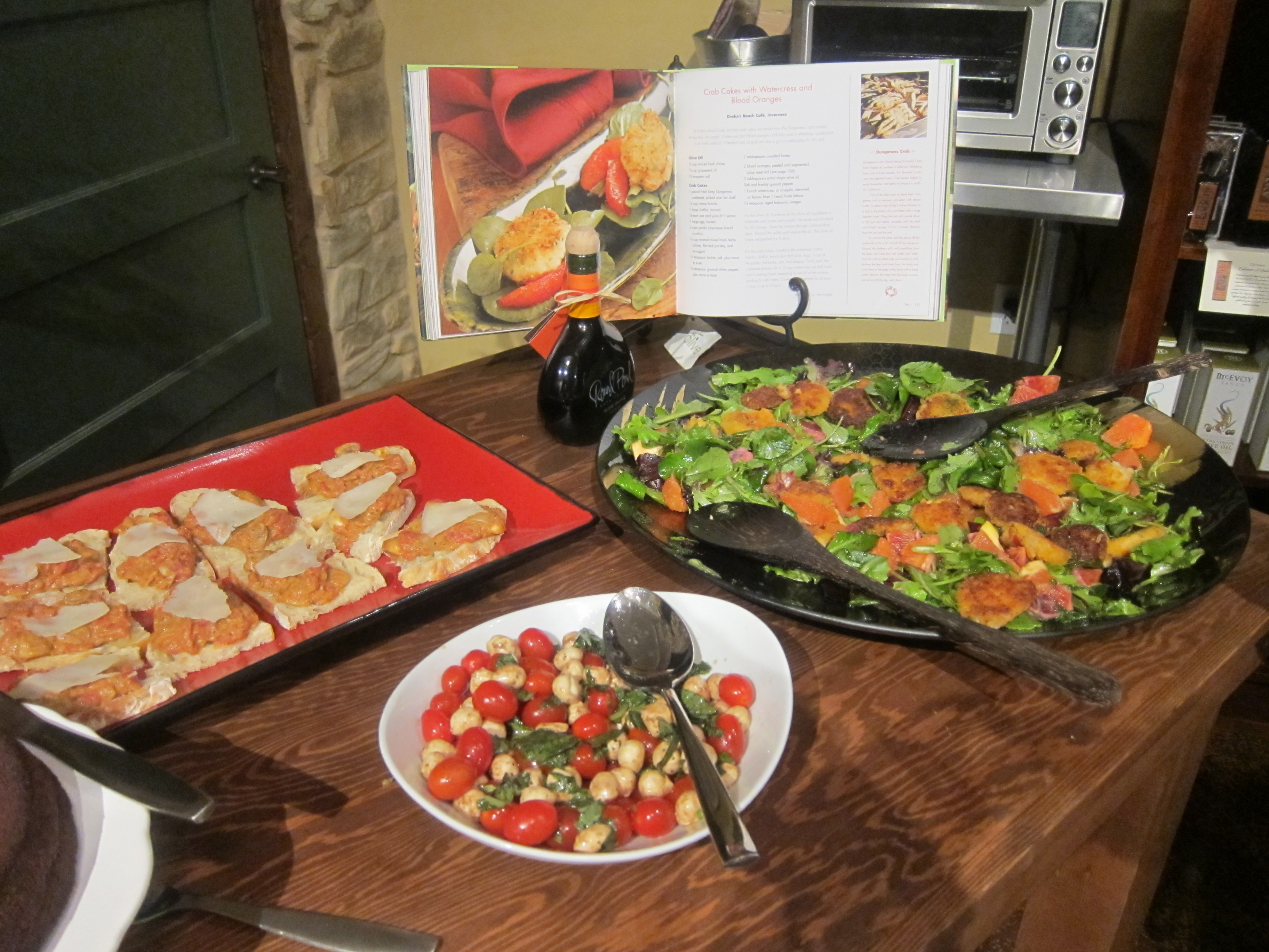 For the first installment of Club Dine In!’s Cookbook Potluck Club, I choose “Organic Marin: From Land to Table” by Tim Porter and Farina Kingsley, for members to cook from and learn about Marin producers. On April 7th, we had an informal meeting for members to become acquainted with the book, meet each other, and learned about Community Supported Agriculture. We had a delicious raffle prize donated by Rustic Bakery and a special Olive Oil and Balsmic Vinegar tasting bar set up by We Olive SF. In addition, we had a very delicious spread of organic appetizers, sparkling citrus refreshments, and wine.