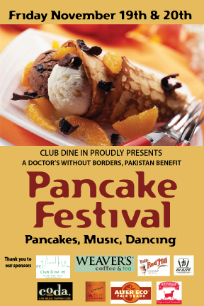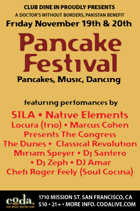 During this season of giving SILA and Club Dine In! will hold a two day benefit concert titled “San Francisco Pancake Festival” on November 19th and 20th at Coda San Francisco. Proceeds will benefit Doctors Without Borders, Pakistan. Buffet-style pancakes included in the ticket price for 11/20. All pancakes will be made using local and/or sustainable ingredients!