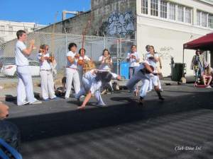 The first-ever Mission Community Market opened with much fanfare (Mission-style) on Thursday, July 22nd. The market is the liveliest in town- Capoeria from Abada Capeoira , Mission musicians Classical Revolution, children and adults playing hopscotch in a dedicated play space, live mural painting, brightly colored summer produce, and locally made arts and crafts. Producers include Happy Boy Farms, Atara Farms, Twin Girls, Tomatero, Blue House, amongst a few others. You can buy hot food prepared by La Cocina and desserts from Sweet Construction. You have to have Sweet Construction’s Pecan Snowball! Or, indulge in locally made soaps and shampoos from Rubber Ducky Soap, a business started from the Women’s Initiative. Also, check out crafts and artisans from MiSBA.